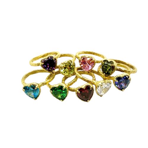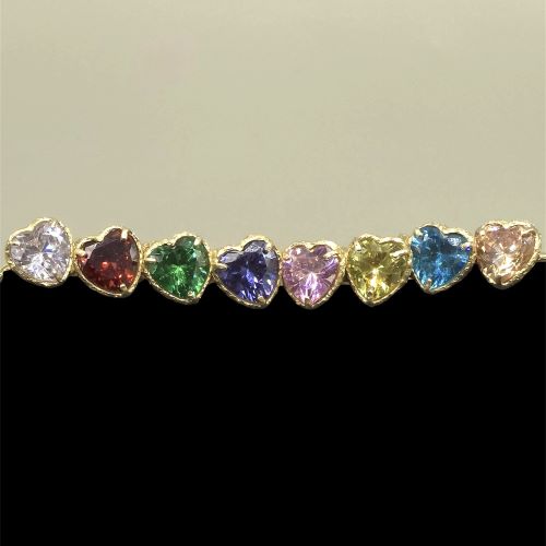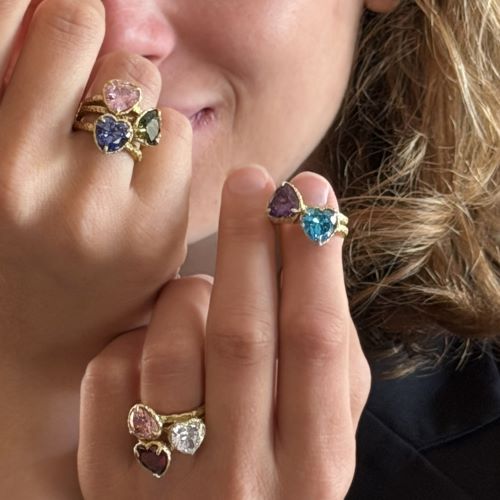Cuori in bronzo, zirconi colorati. Da indossare liberamente, senza regole.